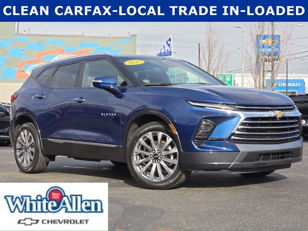 *GREAT DEAL*, LOCAL TRADE IN, BOUGHT AND SERVICED HERE, APPLE CARPLAY, ANDROID AUTO, 20 Wheels, Backup Camera, Bluetooth, Bose High End Sound System, Remote Start, Lane Keep Assist, Lane Departure Warning, Teen Driver, Safety Tech Package, Blind Spot Monitor, Adaptive Cruise Control, Automatic Emergency Braking, HEATED STEERING WHEEL, HEATED LEATHERSEATS.Blue Glow Metallic 2023 Chevrolet Blazer Premier FWD 4D Sport Utility 9-Speed Automatic with Overdrive 3.6L V6 SIDIRecent Arrival! 19/27 City/Highway MPGWhite Allen Chevrolet has been serving the residents of Dayton, Springfield, Huber Heights, Miamisburg, Troy, Fairborn, Springboro, Franklin, Beavercreek, West Carrollton, Moraine and surrounding areas for 90 YEARS!! There is a reason people keep coming to see us generation after generation. Repeat business and referrals are what make us who we are. Come see our beautiful new showroom and state of the art service facility. We have some of the best service advisors and factory trained technicians in the area. Complimentary loaner vehicles are available as well as a local shuttle service. We also offer free pick up and delivery of your vehicle (appointment required). Call us at 937-222-3701 or visit our website at www.whiteallen.com.